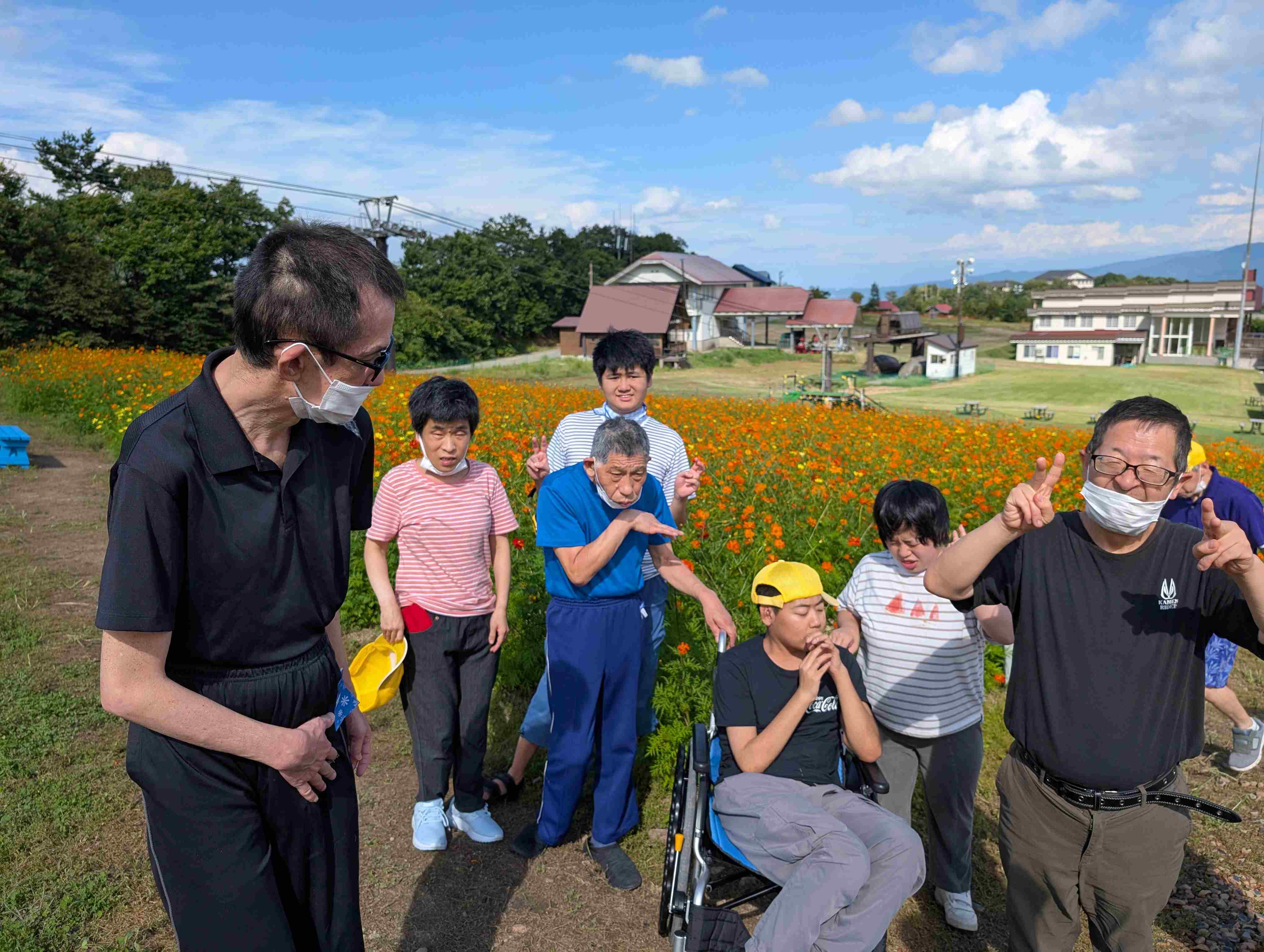 2025/09/23 めるへん キバナコスモスを観に行きました♪ 9月17日にイオックスアローザで開催されていたキバナコスモスまつりにめるへん生活介護の利用者さんで出掛けました。 スキー場の斜面には、鮮やかな琥珀色のキバナコスモスが咲いていました。 その日も暑い日でしたが、斜面から時折吹き降りる涼風とキバナコスモスを見ながら秋の足音を感じました。