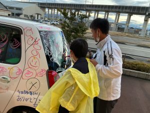 晴れた日のこごみ前に1台の白い車が登場🚗子どもたちは汚れ防止のポンチョを着て手にはマジック🖊一斉にお絵描きタイムスタート😁