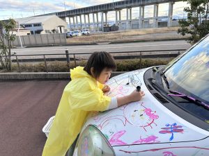自分の好きな生き物やキャラクターを描いたり、大胆にペンを走らせたり、車の底をじっくり観察したり…。
