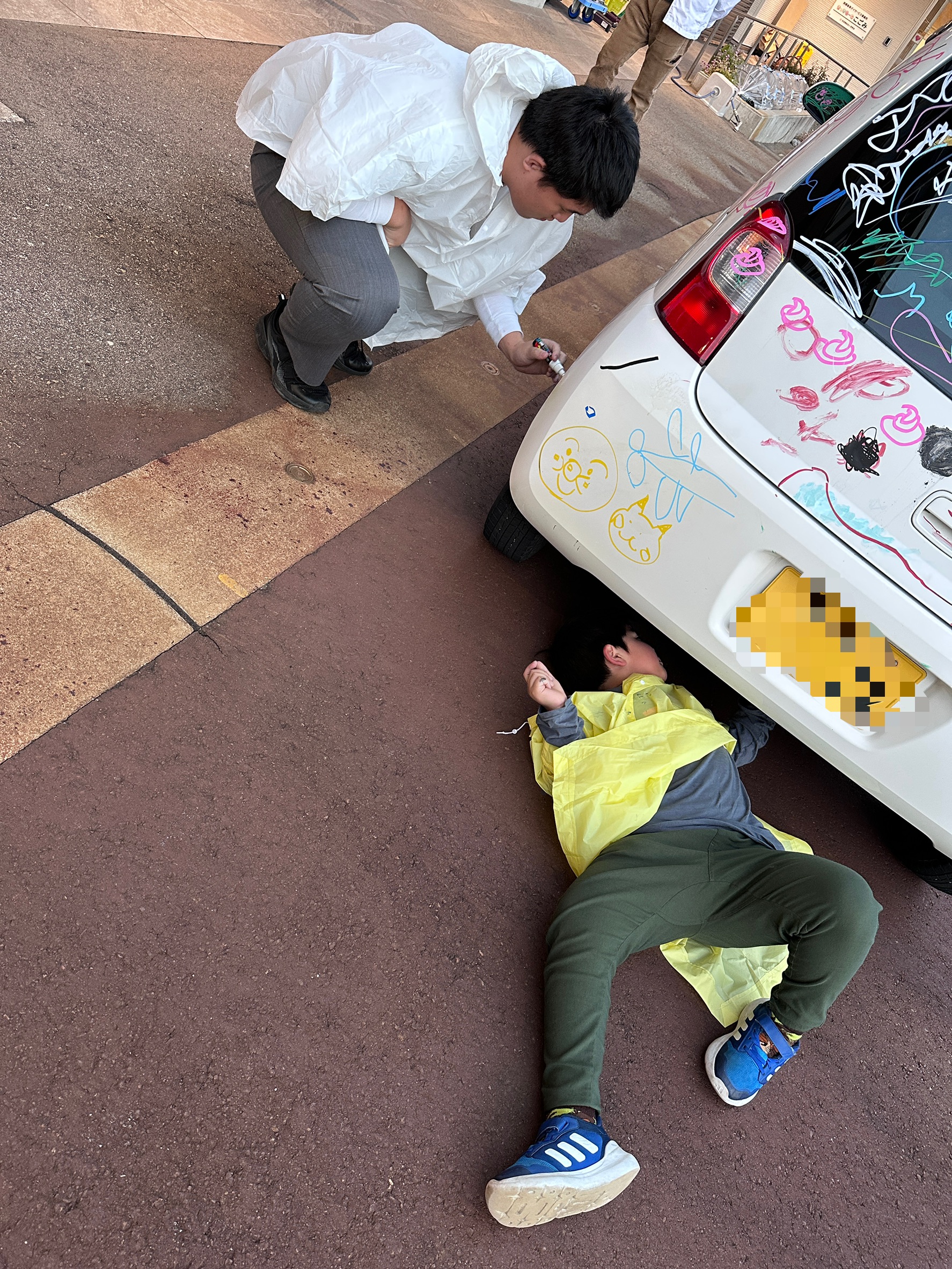 自分の好きな生き物やキャラクターを描いたり、大胆にペンを走らせたり、車の底をじっくり観察したり…。