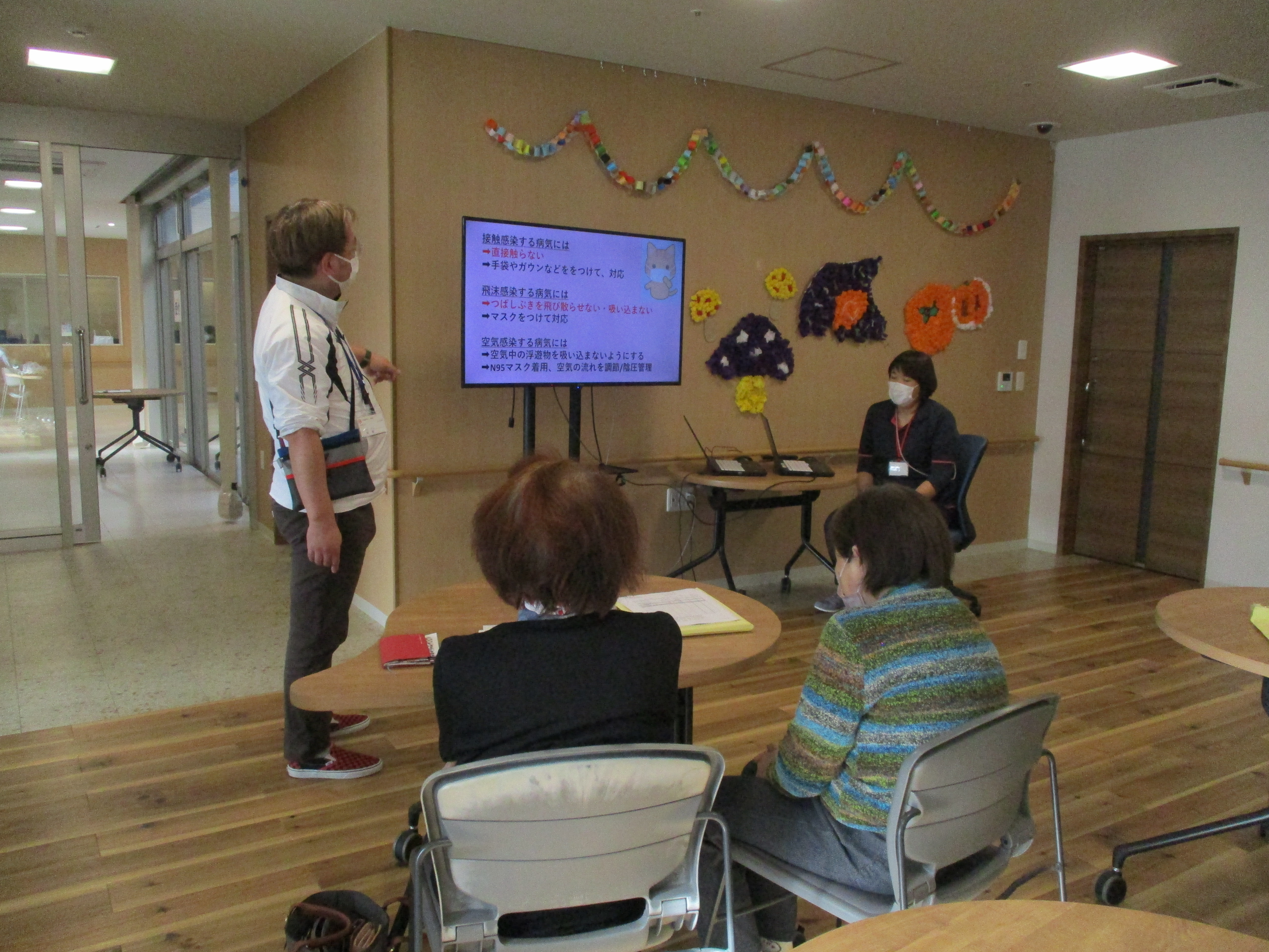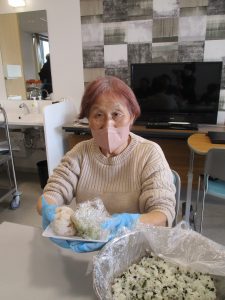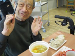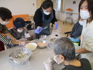2025/12/05 ホームこごみ 11月19日の来所日とおにぎり作り 11月の来所日が行われました。ご家族や成年後見人の方がこごみ事業所の1階「くりからの里」という交流スペースに来所され、利用者様と面会されました。 ①今回は感染対策の説明をしました。 ②来所日終了後、利用者様は2階の多目的スペースでおにぎり作りをしました。 ③昼食で豚汁と力作のおにぎりを食べました。 利用者様のなかには、大きなおにぎりをおかわりしておなかいっぱい、笑顔いっぱいの一日でした。