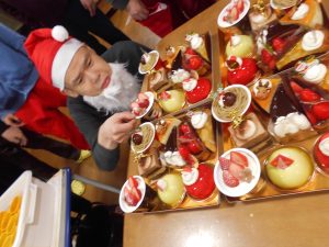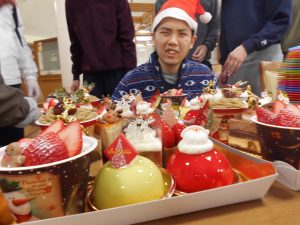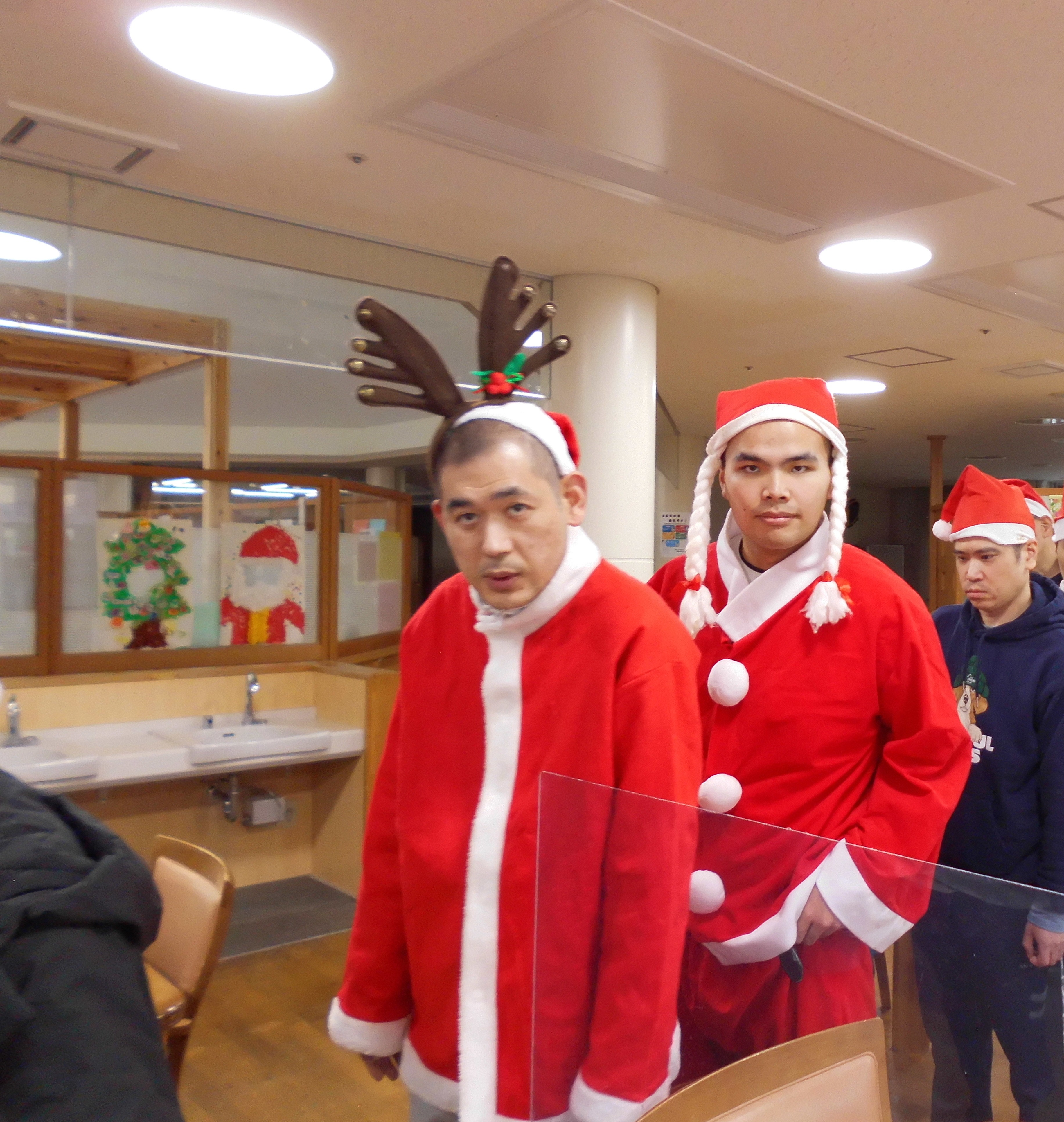 2026/01/06 花椿 Xmas Party✨ 12/23(火)きらめき事業所では、クリスマスパーティを開催しました⛄ 各自パーティ前に、衣装箱から好きな衣装を選び準備は完了👔! バイキング方式で、テーブルに多種多様のケーキを並べて好きなケーキを選んで、召し上がってもらいました🍰 ケーキを食べた後は、プレゼント渡し🎁 サンタさんの長靴に入ったお菓子の詰め合わせや、本、玩具の車など、開封しながら自然と皆さん笑顔があふれていました。 職員も一緒になって、楽しいひと時を過ごせました😊