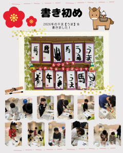 2026/01/14 きっずこごみ きっずるーむこごみ:書初めに挑戦 🌈きっずるーむこごみです。 筆と墨を使って書初めをしました。 今年の干支である馬🏇を「午」「馬」「うま」から選んで見本をみて書き上げました。 雪だるまに、雪を表現したお友だちもいます。 2026年もきっずるーむこごみをどうぞよろしくお願いいたします🙇♀️