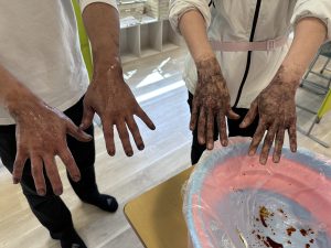 実践研修では、でんぷんのりを使ってうがい液と反応させ、きれいに洗えていない部分を確認しました。爪の間や手首など、しっかり洗っているつもりでも洗い残しがたくさん見つかり、「キャー😱😱😱」と黒く反応した手にびっくり😮
